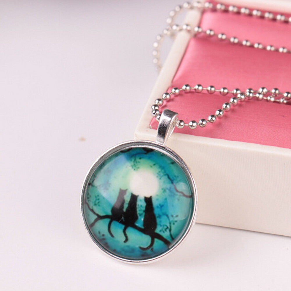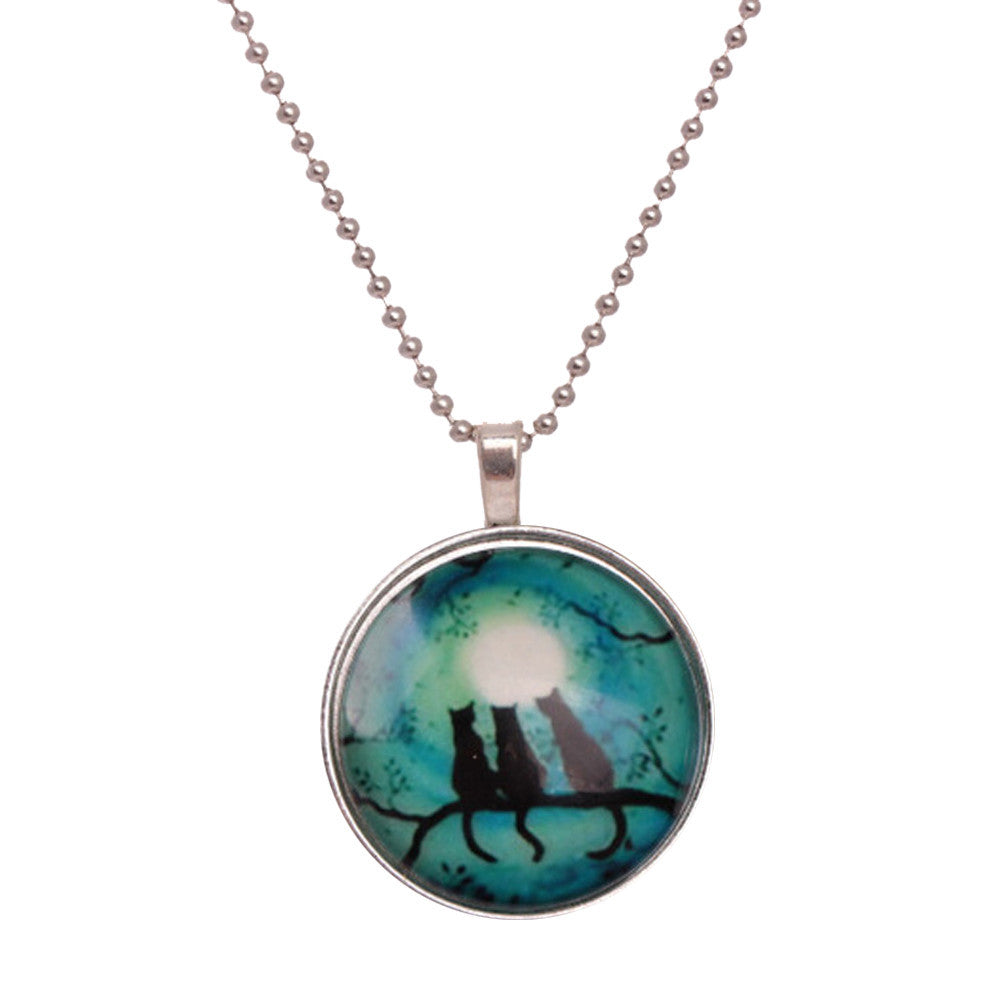 Noctilucent Halloween Cabochon Glass Art Cat Pendant Necklace Chain
